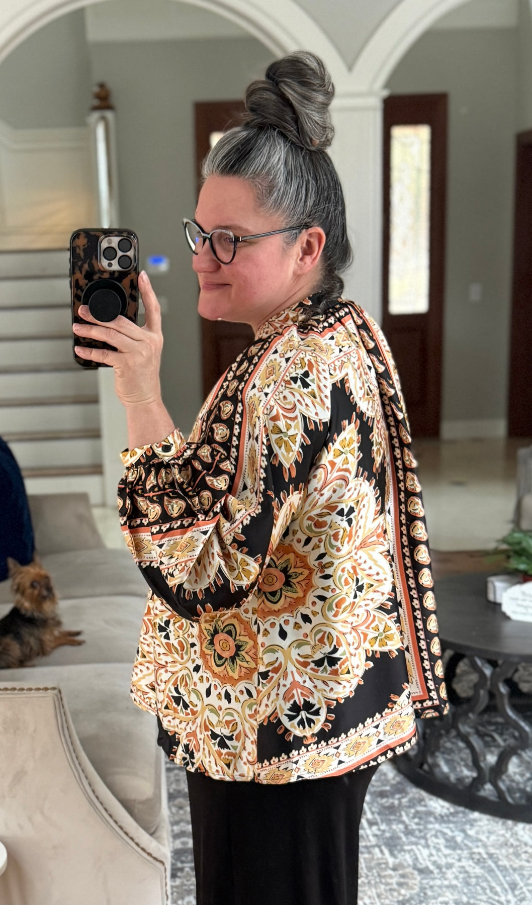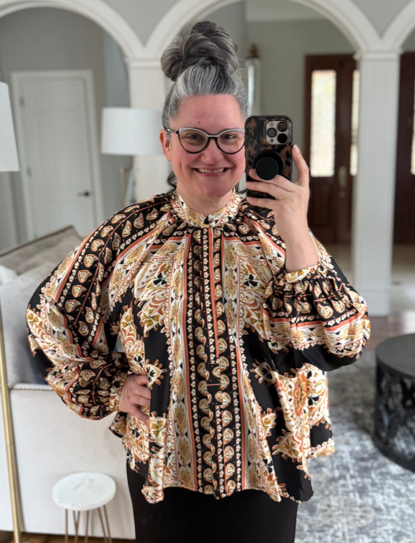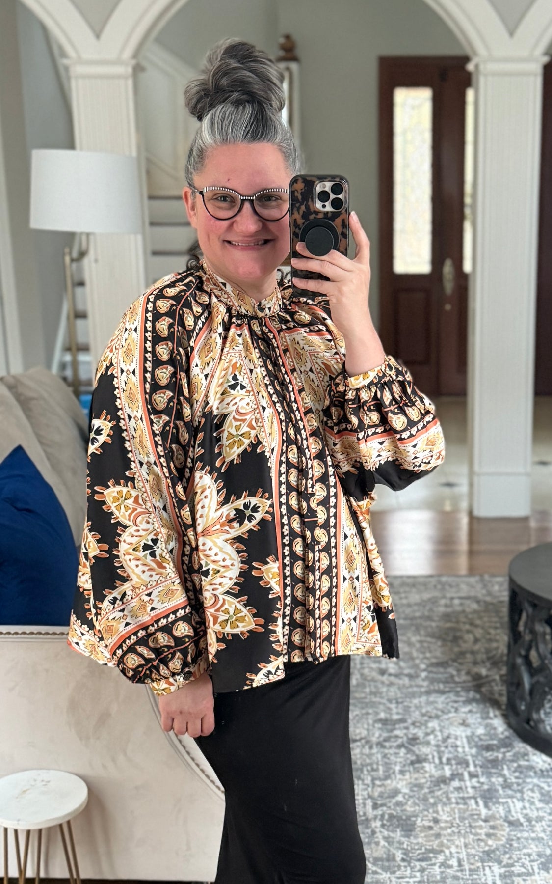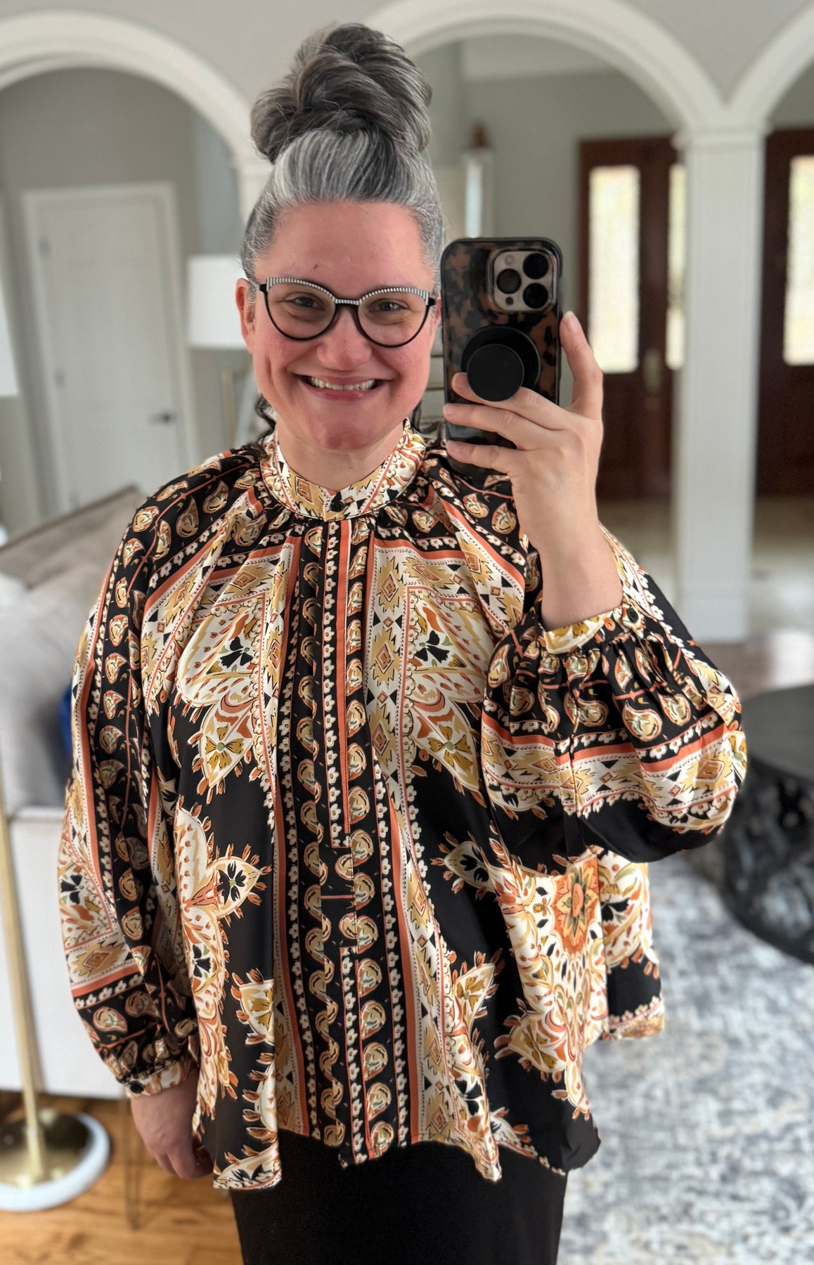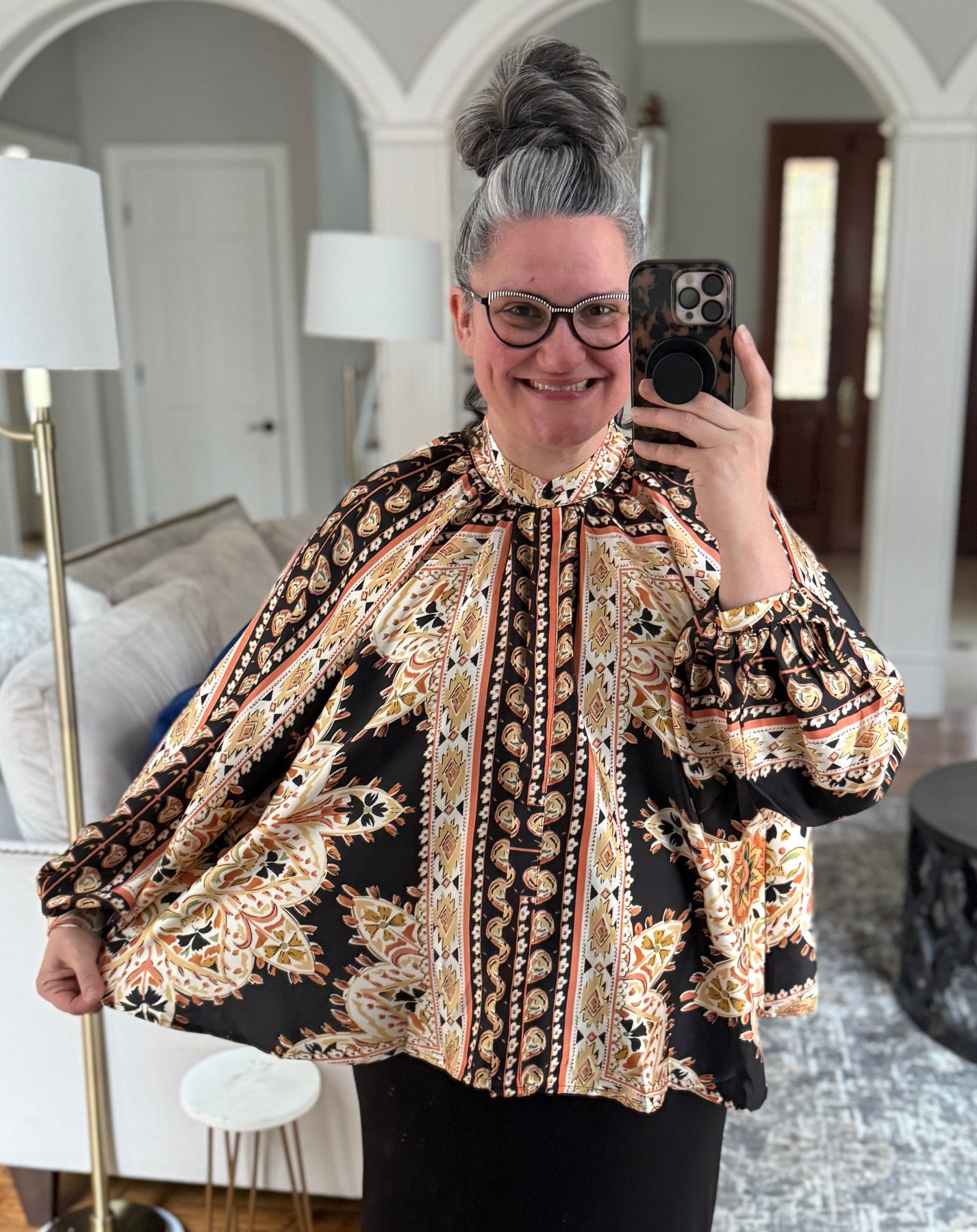 This awesome printed blouse is a swing style, balloon sleeves, mandrian collar with hidden buttons
