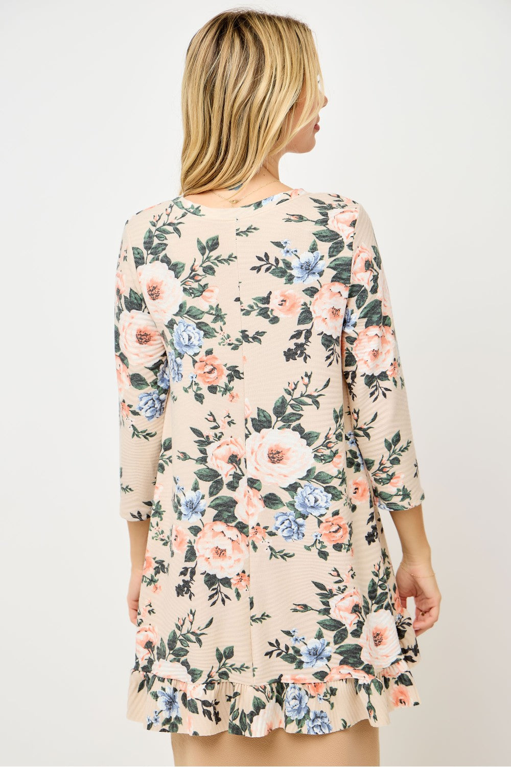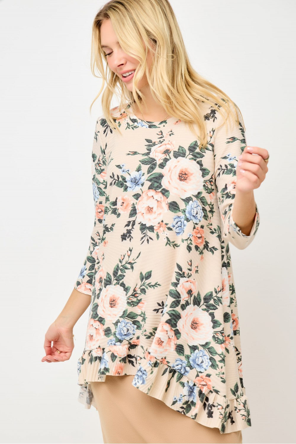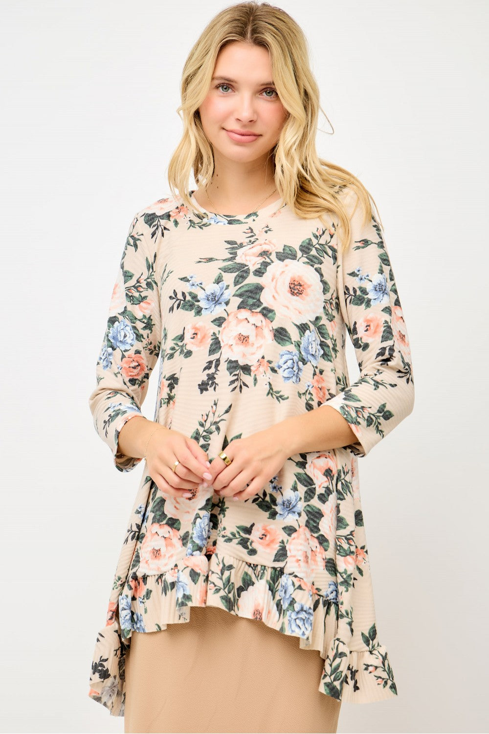 Taupe Floral print with a dainty ruffle detail in the hi/lo hem. 3/4 sleeves and nice modest neckline. Non wrinkle fabric and cool to the touch.