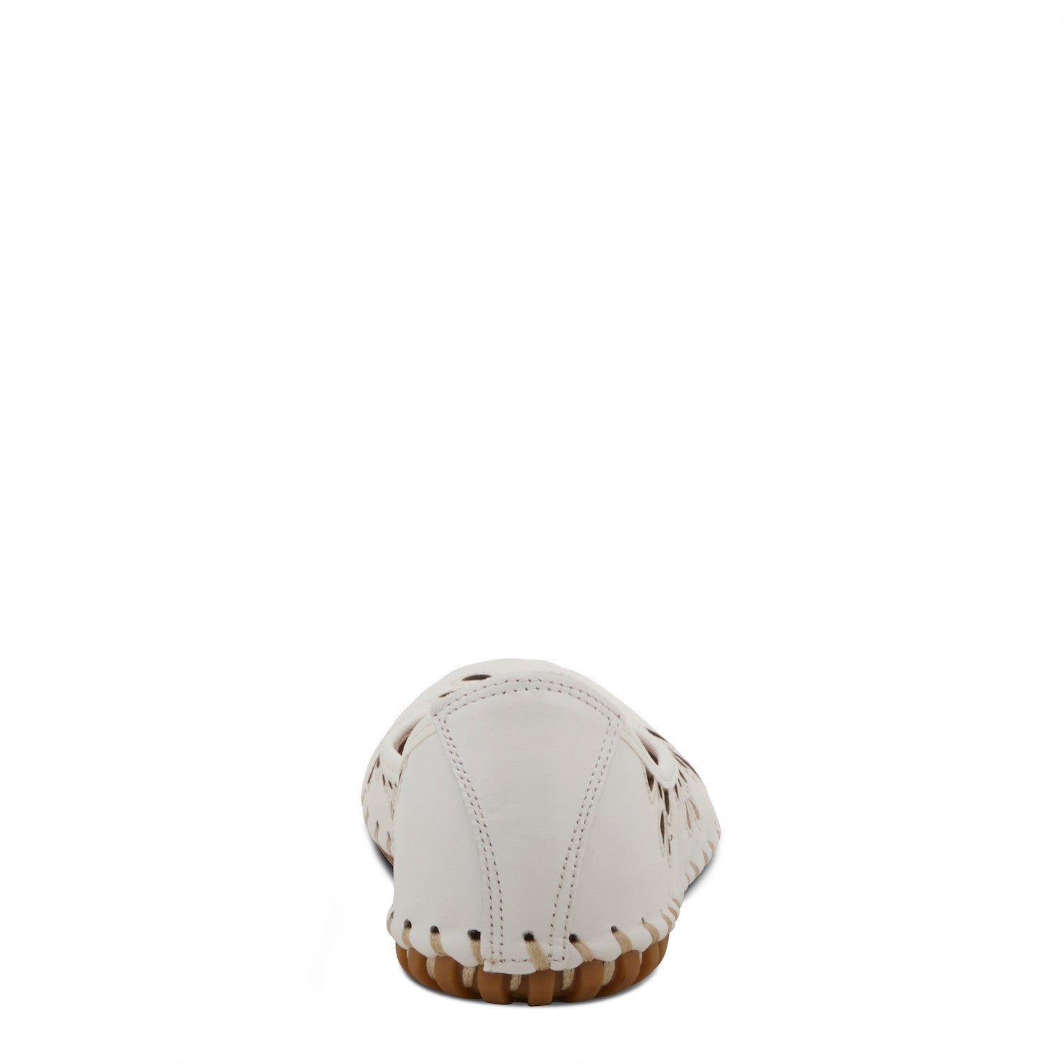 Show stopping leather slip-on ballerina flat is a European influenced design featuring floral shape laser cutouts and outlining stitch design for a unique modern appeal on an incredibly flexible and comfortable stitch to construction sole.