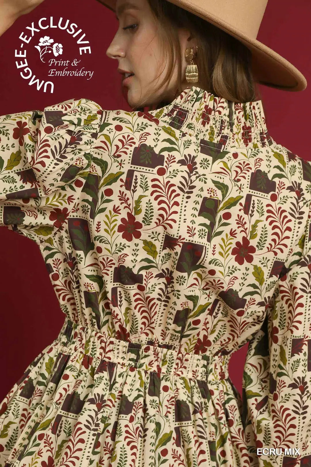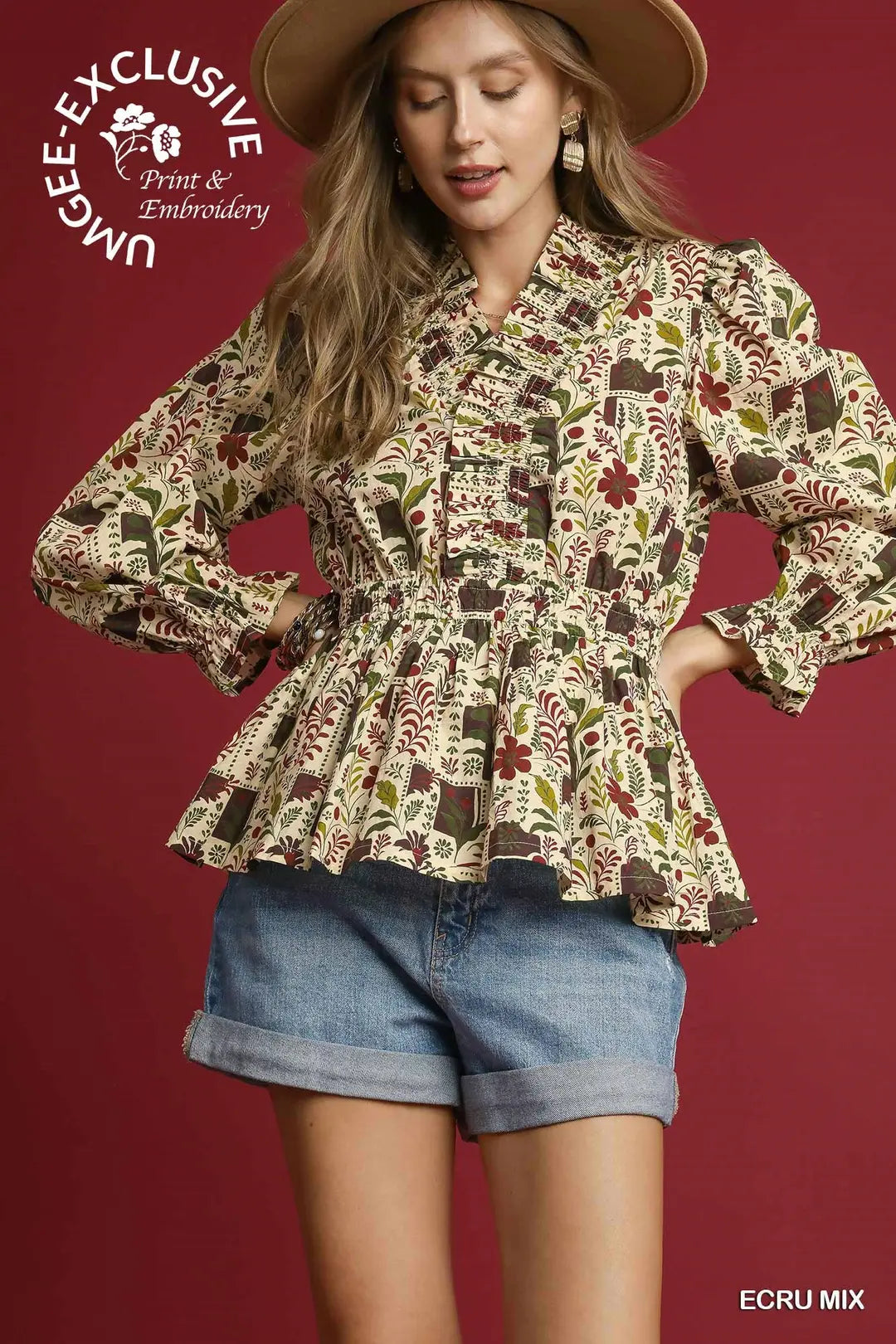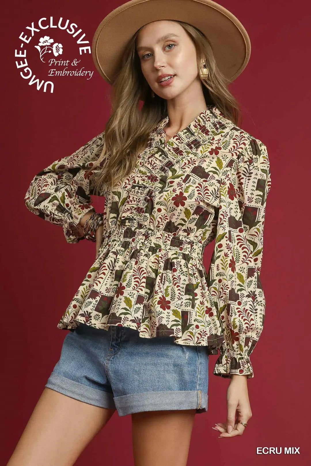 This blouse features a refined ruffled high neck complemented by a ruched V-panel for subtle texture. Its long puff sleeves end in smocked cuffs, enhancing comfort and fit. The smocked waist cinches neatly, flowing into a peplum flare that offers a flattering silhouette. Crafted without lining, it delivers lightweight wear ideal for layering or warmer days.