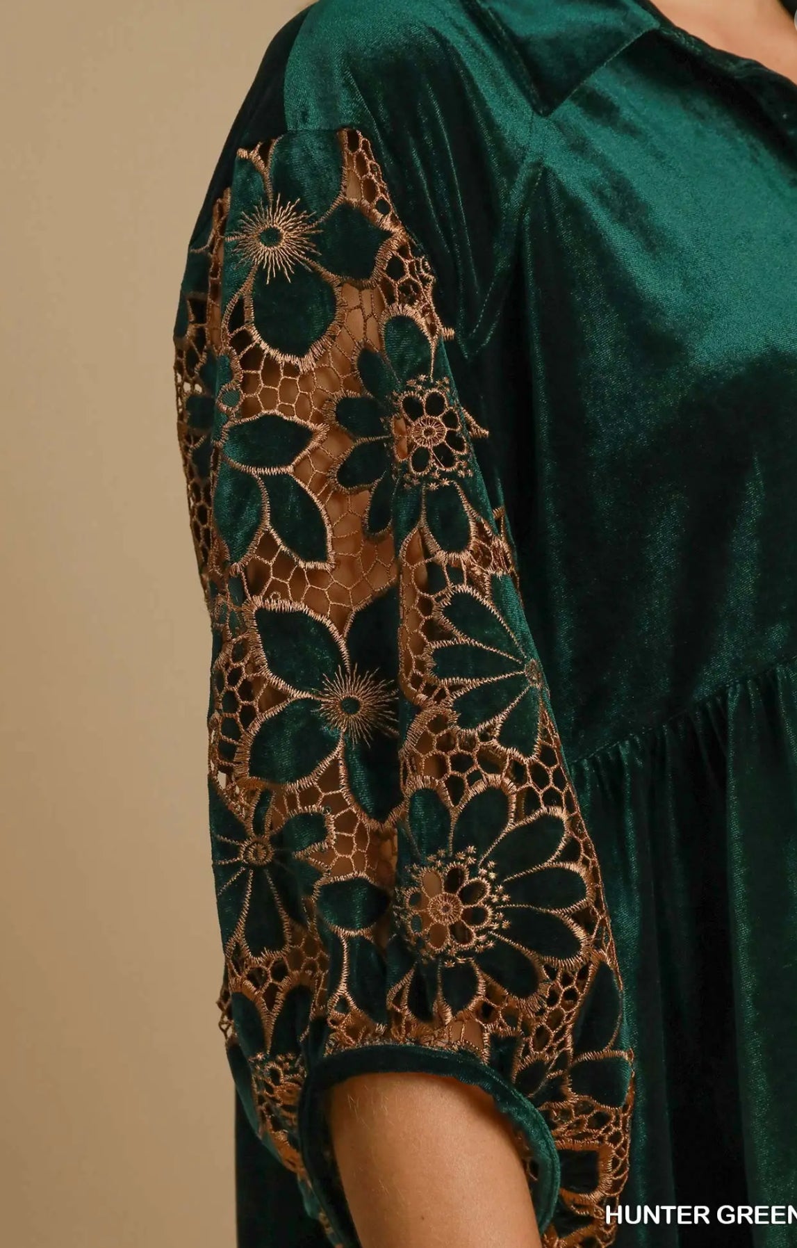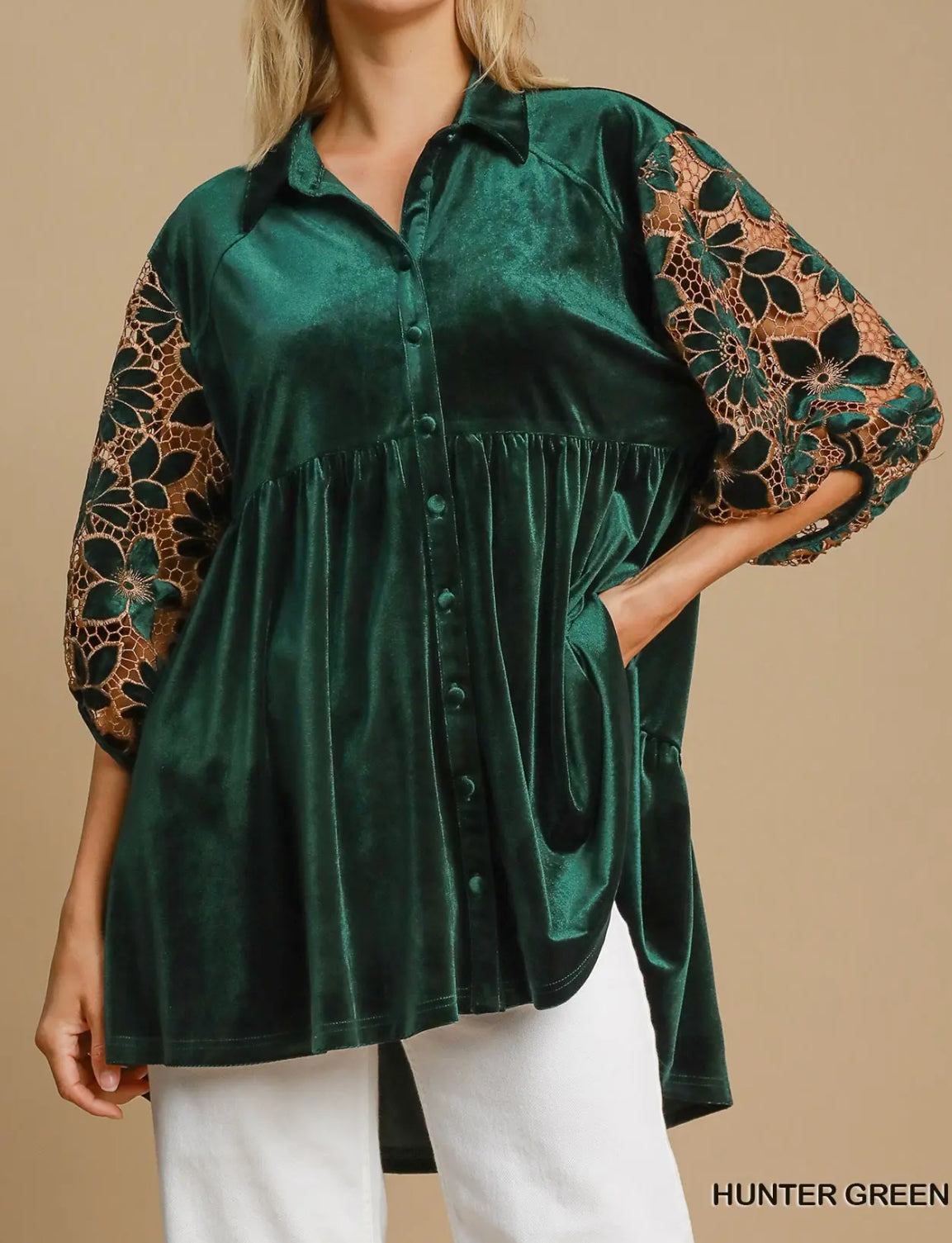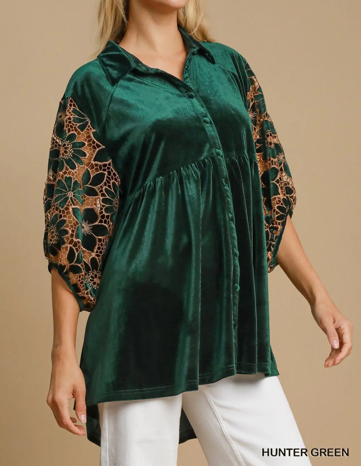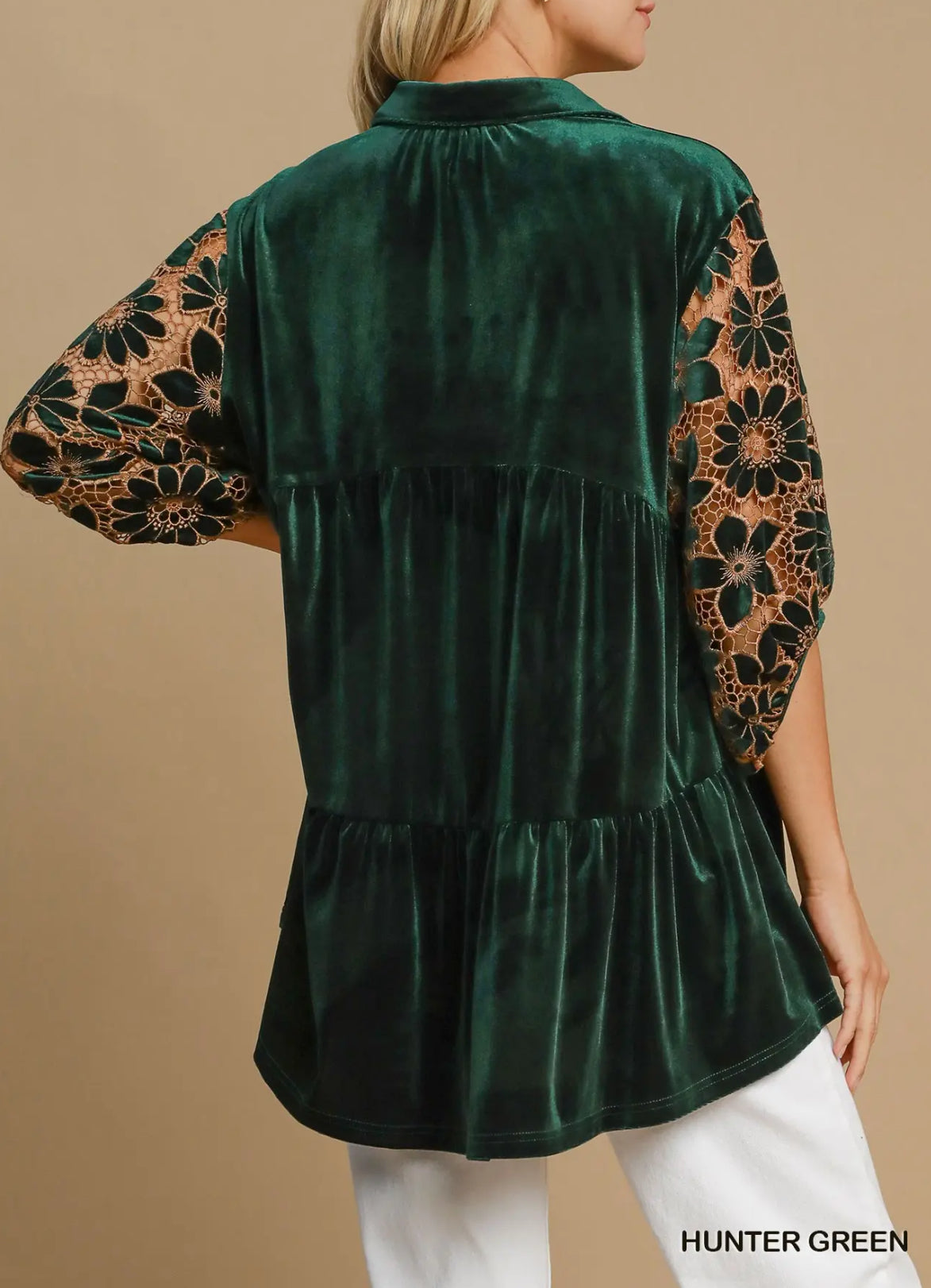Umgee ~ Floral Lace Sleeve Velvet Top ~ Hunter Green